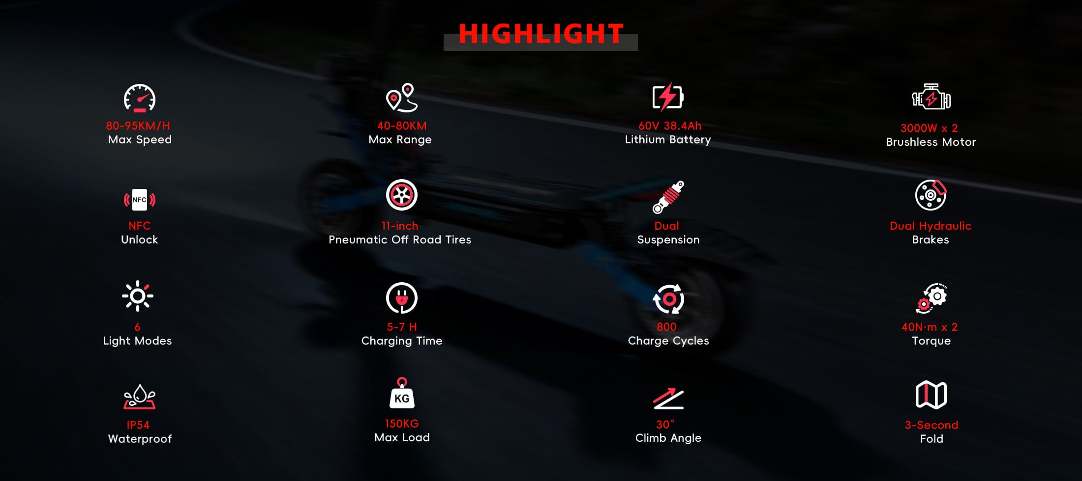 Experience dual 60V 6000W power and an imported 60V 38.4Ah battery, reaching 80–95 km/h with up to 80 km range. Designed for riders who value performance and style, every detail—from premium rubber footpads to advanced suspension—ensures stability, comfort, and precise control. Its sleek, elegant design makes every ride feel luxurious, while remote-controlled RGB lights and Bluetooth music add a personalized, thrilling touch. Effortlessly switch between urban commuting and off-road adventures, and enjoy a ride that’s both powerful and graceful.