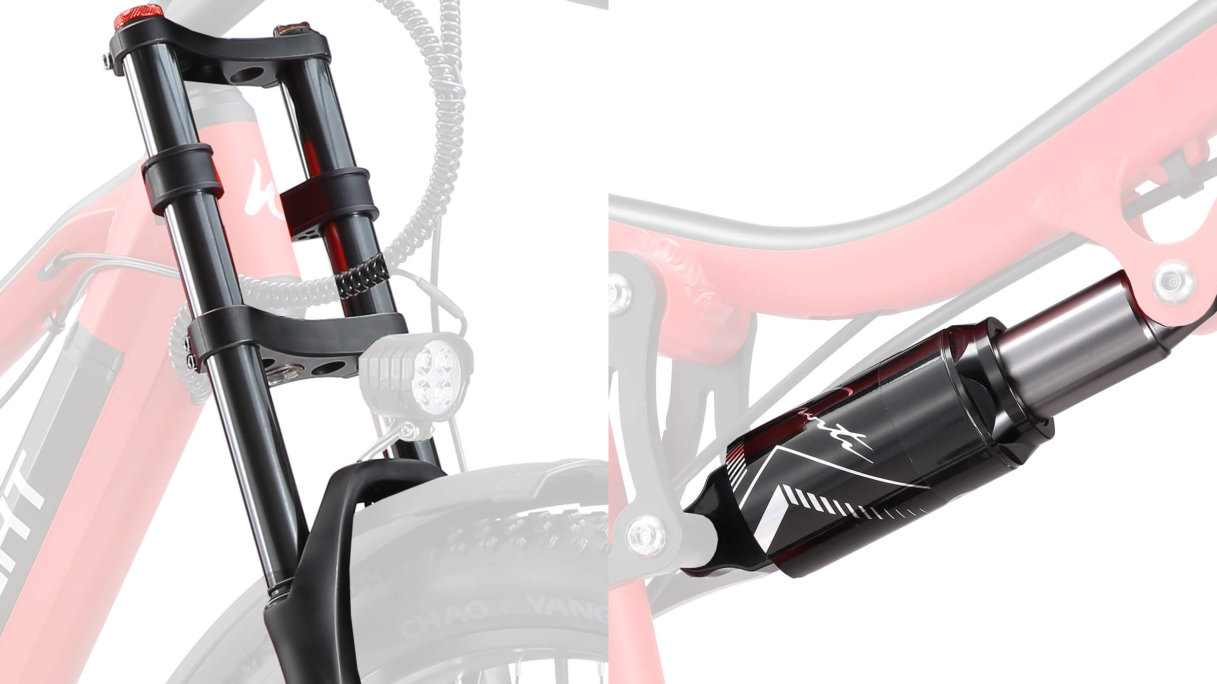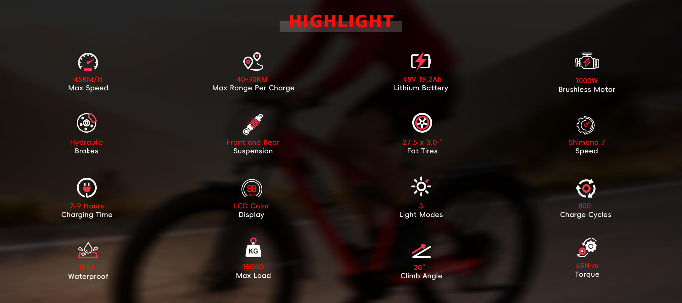 Equipped with a 48V 1000W motor and 19.2Ah battery, the H03 reaches 45–50 km/h with up to 70 km range. Dual suspension with hydraulic front fork and 27.5 x 3.0” fat tires ensures smooth, stable rides on any terrain. Hydraulic disc brakes guarantee safe, precise stopping, while full-coverage fenders protect against splashes. The rear cargo rack adds practicality, and the striking red frame combines bold style with uncompromised performance.