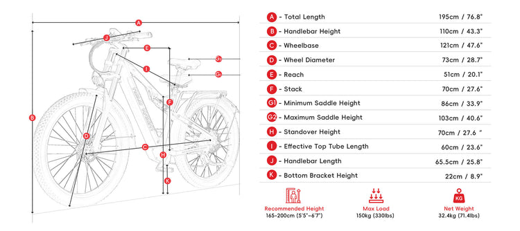 R : Le poids recommandé du cycliste est d'environ 150 kg (environ 330 lb) et la taille du cycliste est de 5,2 à 6,8 pieds.