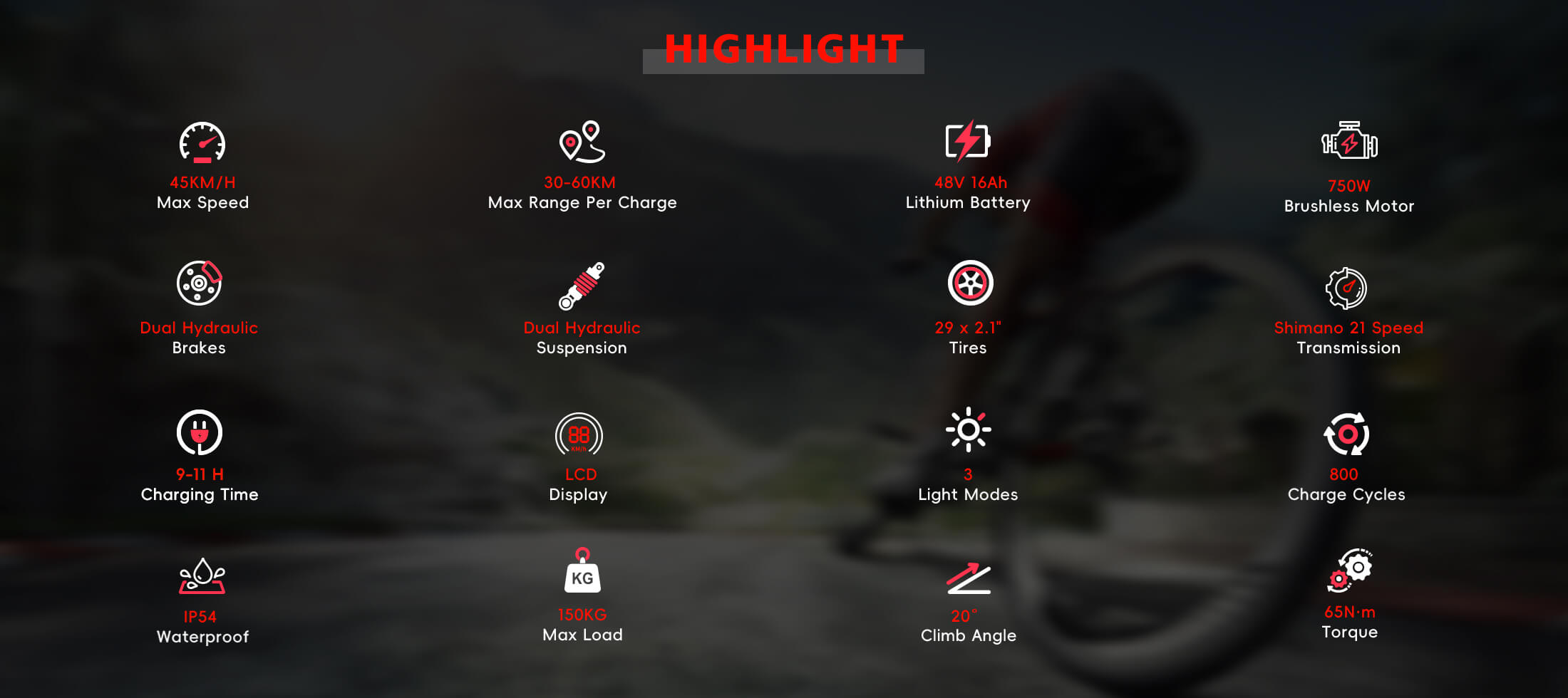 Napędzany silnikiem 48 V o mocy 750 W i akumulatorem 16 Ah, H02 osiąga prędkość 45–50 km/h i zasięg do 60 km. Duże, 29-calowe opony i przednie zawieszenie amortyzują nierówności, zapewniając płynną i komfortową jazdę. Zintegrowane przednie i tylne światła zwiększają bezpieczeństwo, pełne błotniki chronią przed zabrudzeniem, a tylny bagażnik zapewnia praktyczne miejsce do przechowywania. Wysoka wydajność w najlepszej cenie sprawia, że H02 to idealny, wszechstronny rower elektryczny do dojazdów do pracy.