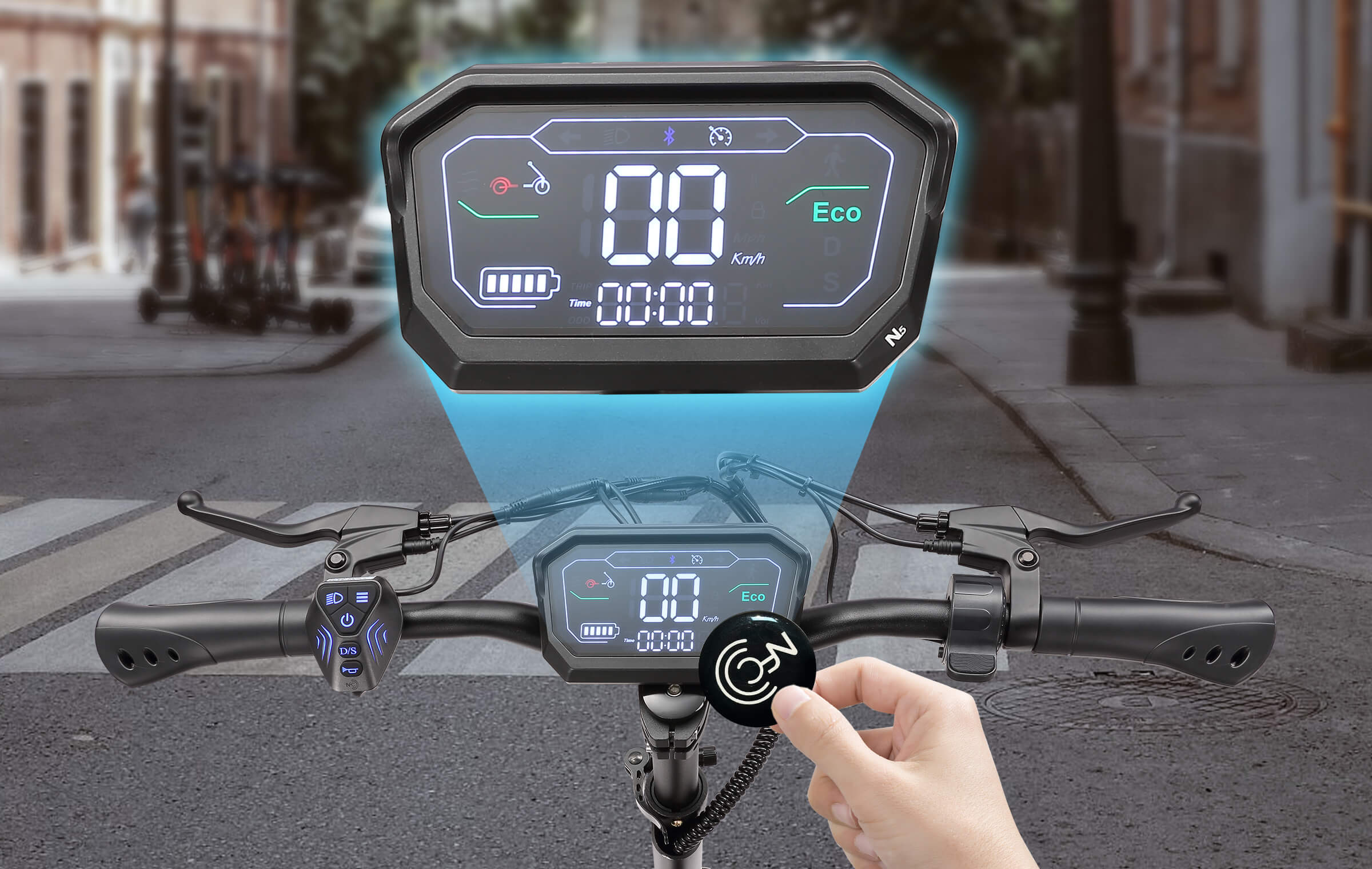 The T104 features a central LED display that clearly shows speed, mileage, gear, and battery level. NFC keyless unlock allows instant, seamless start for every ride, combining smart control with effortless operation.