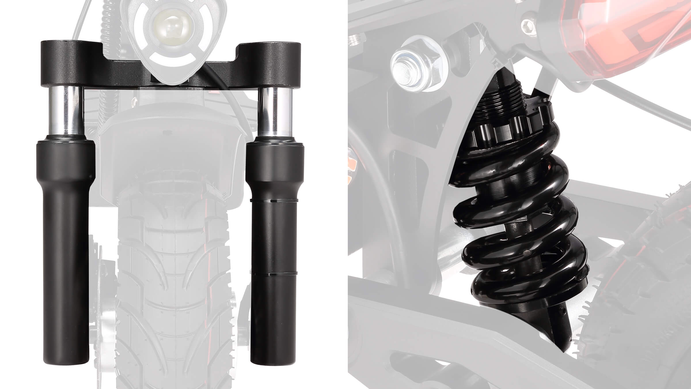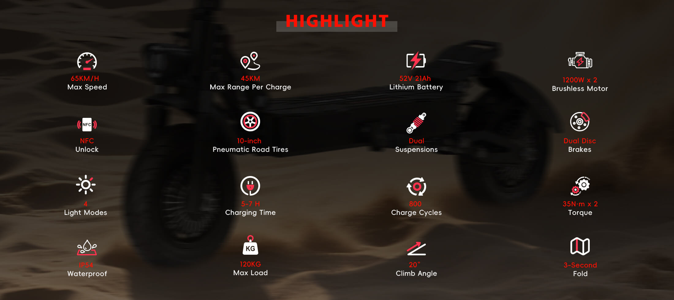 Unleash the city and beyond with the T104’s dual 52V 1200W motors delivering up to 60–65km/h and a 45km range on a single charge. Stay in control with the central LED display and Bluetooth remote, while 10-inch puncture-proof tires and advanced suspension ensure a smooth, safe, and comfortable ride. Switch seamlessly between urban commuting and off-road adventures—power, speed, and freedom in one ride.
